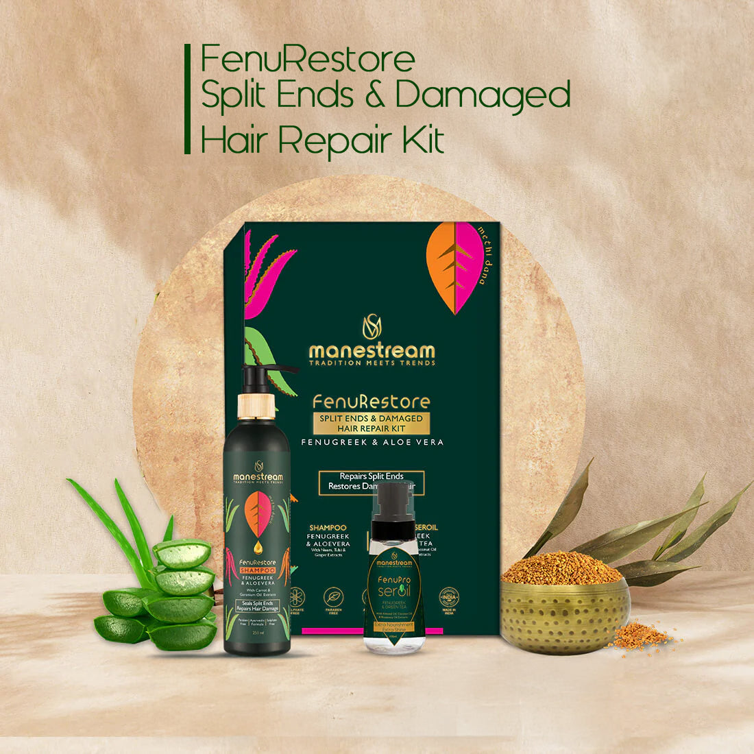 Manestream's Fenurestore Split-ends and Damaged Hair Repair Kit is a delight for your dry, dull, and damaged hair that will naturally nourish and moisturize your hair, all while correcting any damage caused by chemical treatments and other internal or external forces. This kit is hailed for its restorative blend of ayurvedic herbs like Fenugreek, Aloe Vera, Neem, Tulsi, and Ginger, as well as powerful oils like Bhringaraj, Shankhapushpi, and Geranium, which work together to give you silky, smooth, and resilient hair. To get the best results, include this kit into your hair regimen step by step.