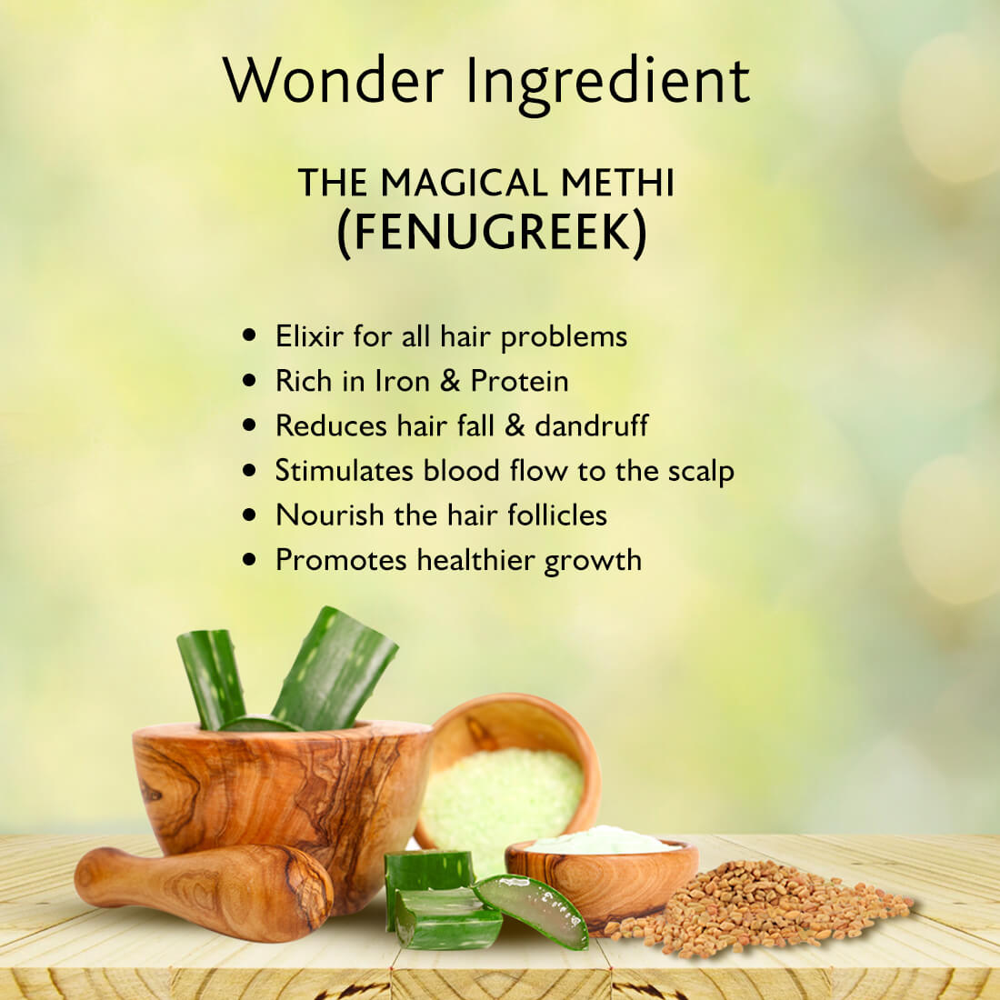 ►Fenugreek: Methi (Fenugreek) is the ideal elixir for essential hair care and scalp wellbeing, capable of curing practically any hair ailment. Methi seeds have been used to cure hair loss and fall, itchy scalp, excessive dryness or oiliness, and premature greying.